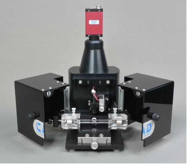 上圖為微電泳法測試zeta電位的設備,前端兩側為四個電極,進行正向和反向加電場,最上方為CCD相機,進行對運動的帶電粒子做視頻跟蹤,得到信號,從而得到每一個顆粒的遷移率,計算得到每個顆粒的zeta電位,從而得到zeta電位的分布。