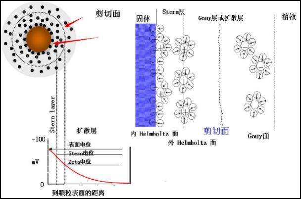 粒子表面存在的凈電荷,影響粒子界面周圍區域的離子分布,導致接近表面抗衡離子(與粒子電荷相反的離子)濃度增加。于是,每個粒子周圍均存在雙電層。